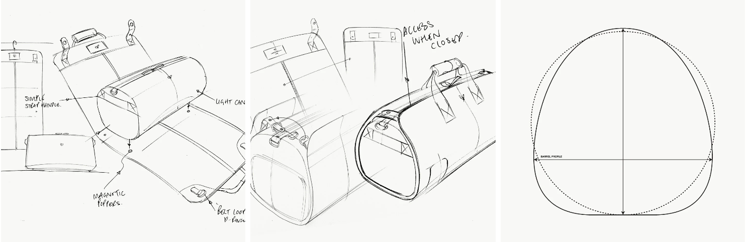另一個關鍵的設計考慮因素是重量,因為旅行袋與西裝套組裝後比標準手提包有更多的層數,因此我們必須對使用的材料和位置進行重新設計。西裝套外層採用防水 24 盎司帆布面料,西裝套內部是柔軟的 12 盎司棉質布料,可減少西裝與西裝套之間的摩擦。旅行袋手採用 18 盎司的輕質防水斜紋布製成,讓整體重量輕量化。