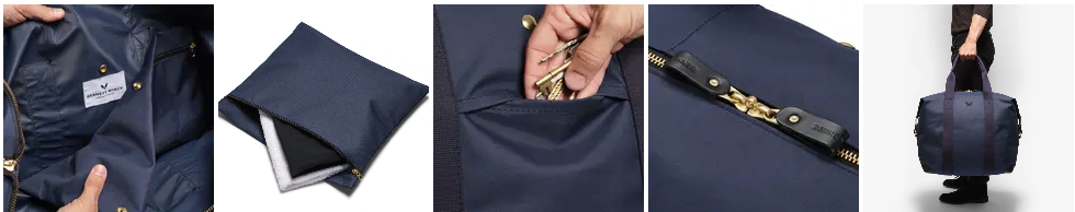 軍規棉帆布手柄、托斯卡納皮革飾邊和實心黃銅五金都經得起長時間的使用,同時內附可拆卸的防水袋,可以放置髒污衣物或是濕毛巾,與乾淨衣物分開。包包外側有個方便放置手機或是皮包的口袋,讓收納袋除了有好看外觀,它也具有絕佳的功能性。