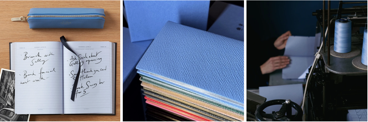 具有「高級品質的文具和精美物品」之譽的英國品牌Smythson,創始人Frank Smythson,在1908年發明了革命性的巴拿馬羽量級筆記本(Panama ‘Featherweight’ Diary),帶來前所未見的超薄淡藍色羽毛紙,薄薄紙張卻有無比強韌度,足以承受鋼筆的穿透力,紙張為普通紙厚度的一半.成為世界上第一本輕薄可以隨身攜帶的筆記本。使用十字紋軟皮革裝訂,堅固且耐用。