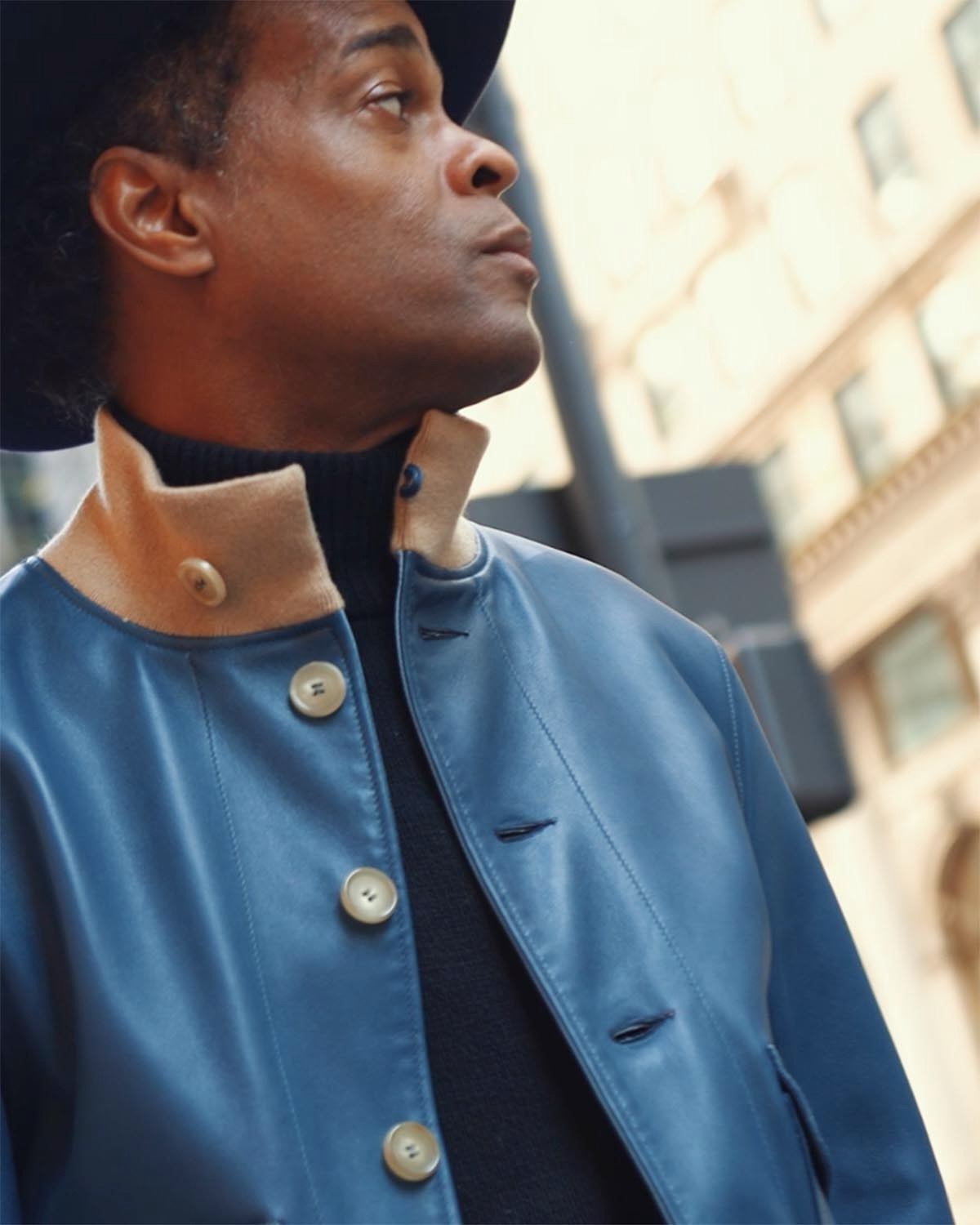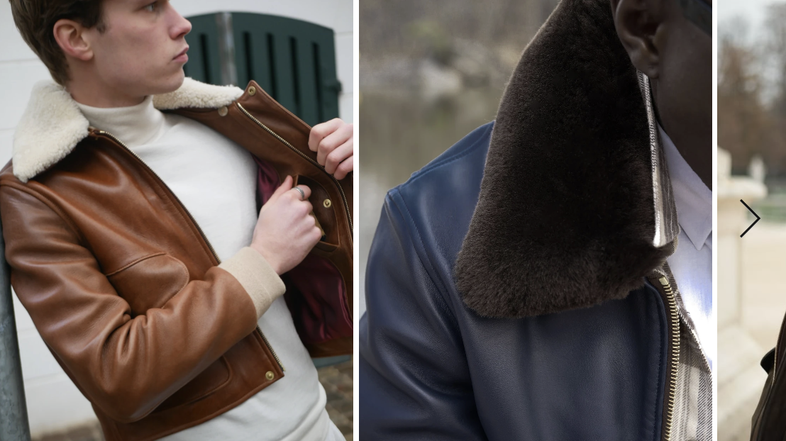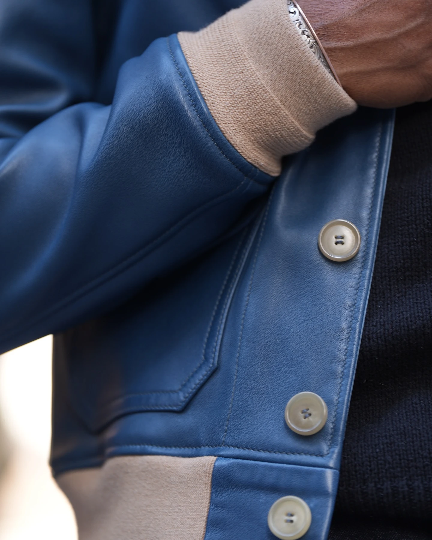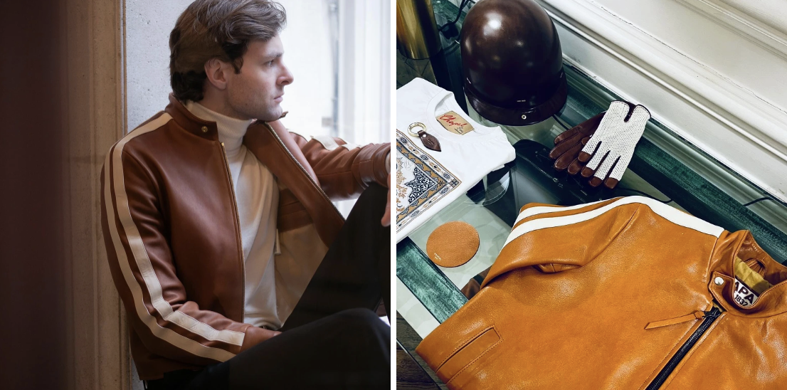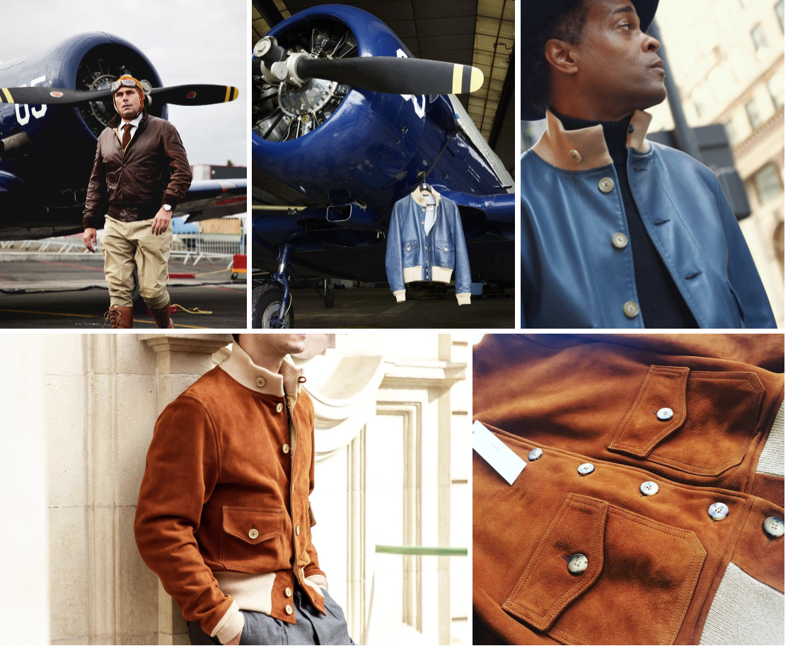 以柔韌羊皮製作,剪裁俐落、質感細膩。A1 夾克因 Charles Lindbergh 1927 年橫越大西洋時所著而聞名,標誌性的羅紋領口與八顆鈕扣設計,展現軍事風格與法式優雅的融合。